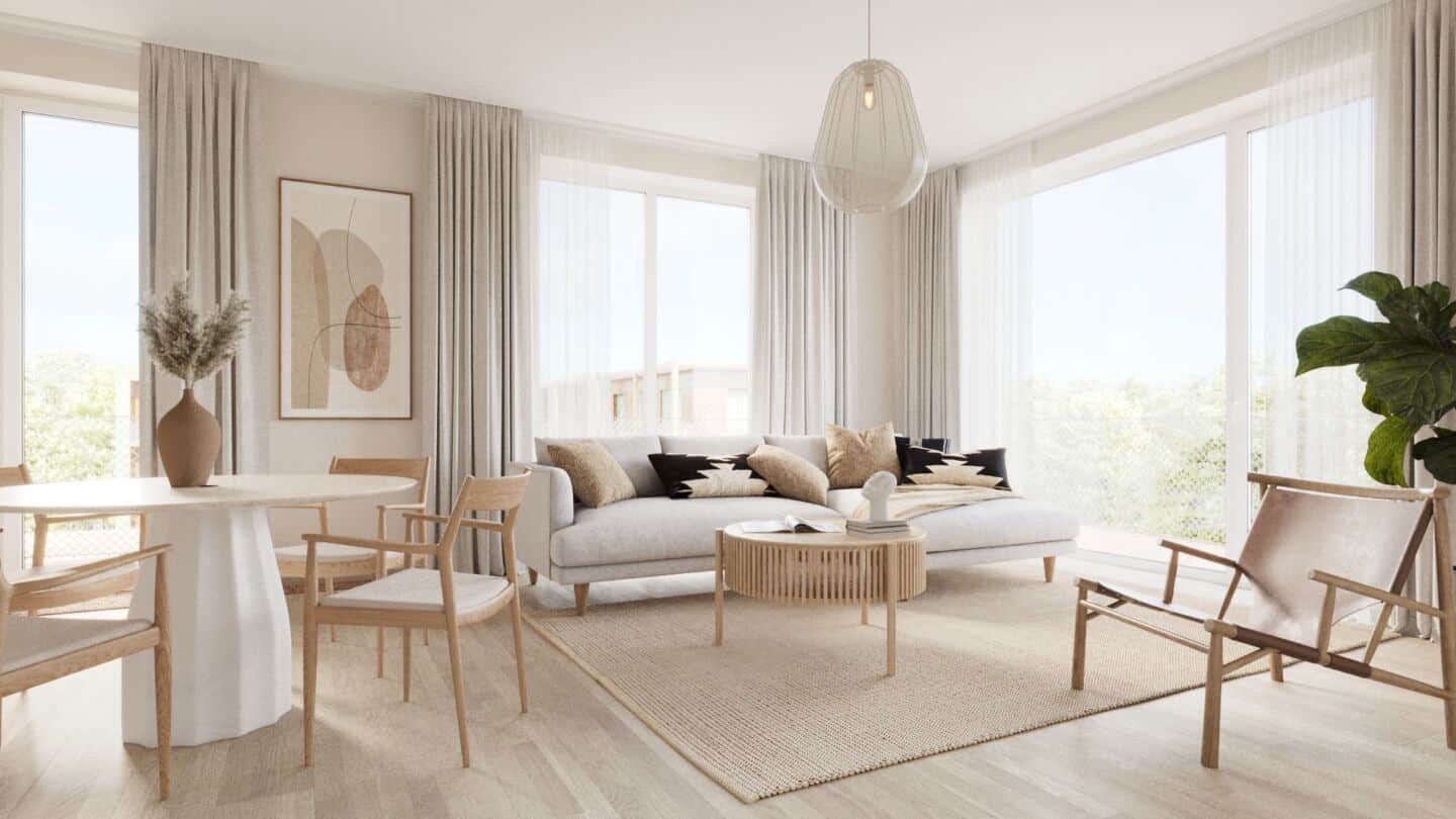 Напольное покрытие из светлого дуба, оттенок которого сочетается со стенами цвета слоновой кости, натурально-белого и древесно-коричневого. Натуральные и природные цвета. Простор и классика. Отделка несет в себе элементы светлого скандинавского стиля и и богемного дизайна бохо.
