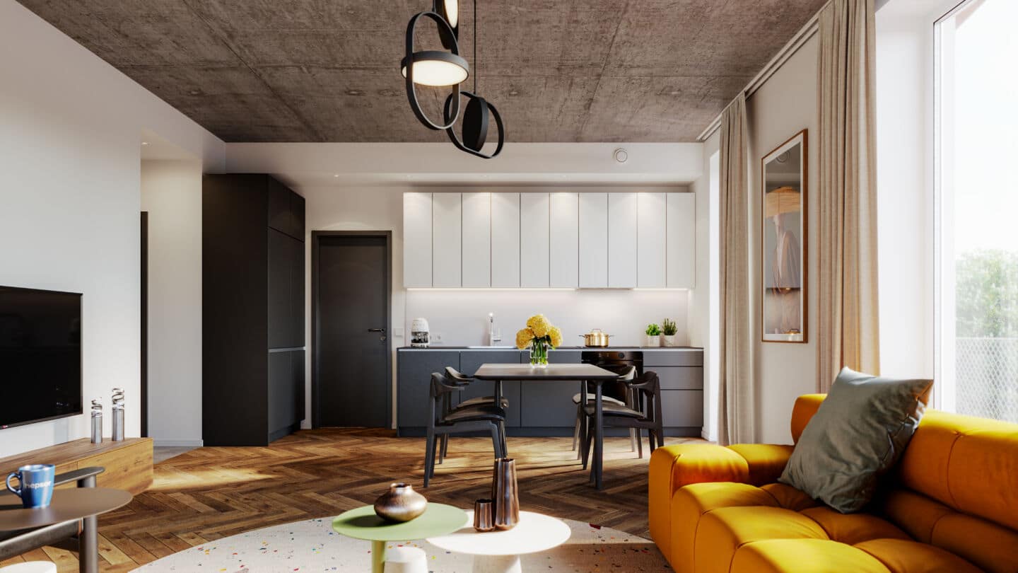 Сочетание темного дубового паркета с бетонным потолком обладает собственным характером, в котором ощущается и тяга к экспериментам, и ностальгическая атмосфера ретро.