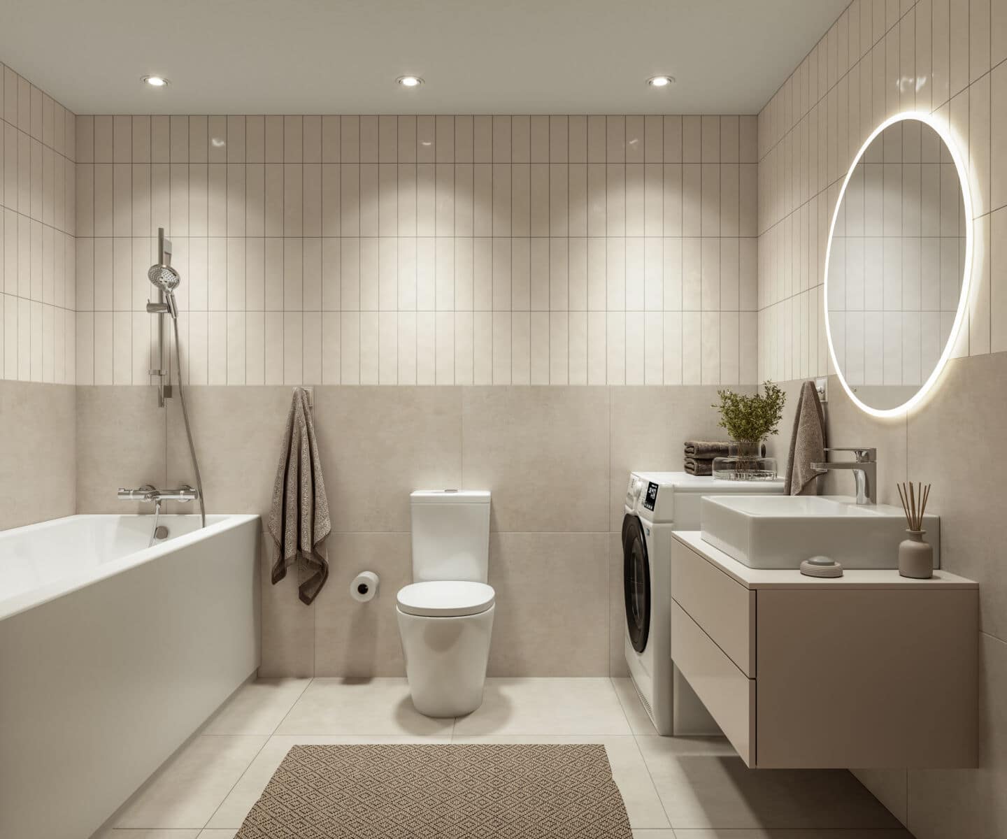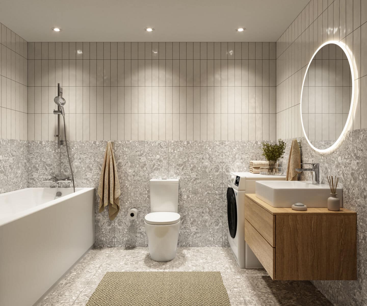 Настенная плитка (маленькая): 75×300 mm, Pamesa Ceramica, Pasta Blanca, Grace Ocre, глянцевая Настенная плитка (большая): 600×600 mm, Doria Greige, мат, rectified
